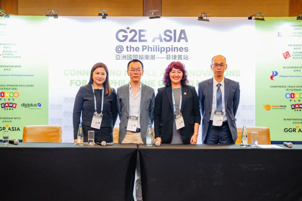 (L-R) Panelists Nerie Aquino; Erick Su, Head of ArenaPlus at DigiPlus; Ma. Vina Claudette Oca; and Moderator Ryan Hong-Wai Ho at the “Innovations in Responsible Gaming and CSR” session at Day 2 of G2E Asia PH 2025